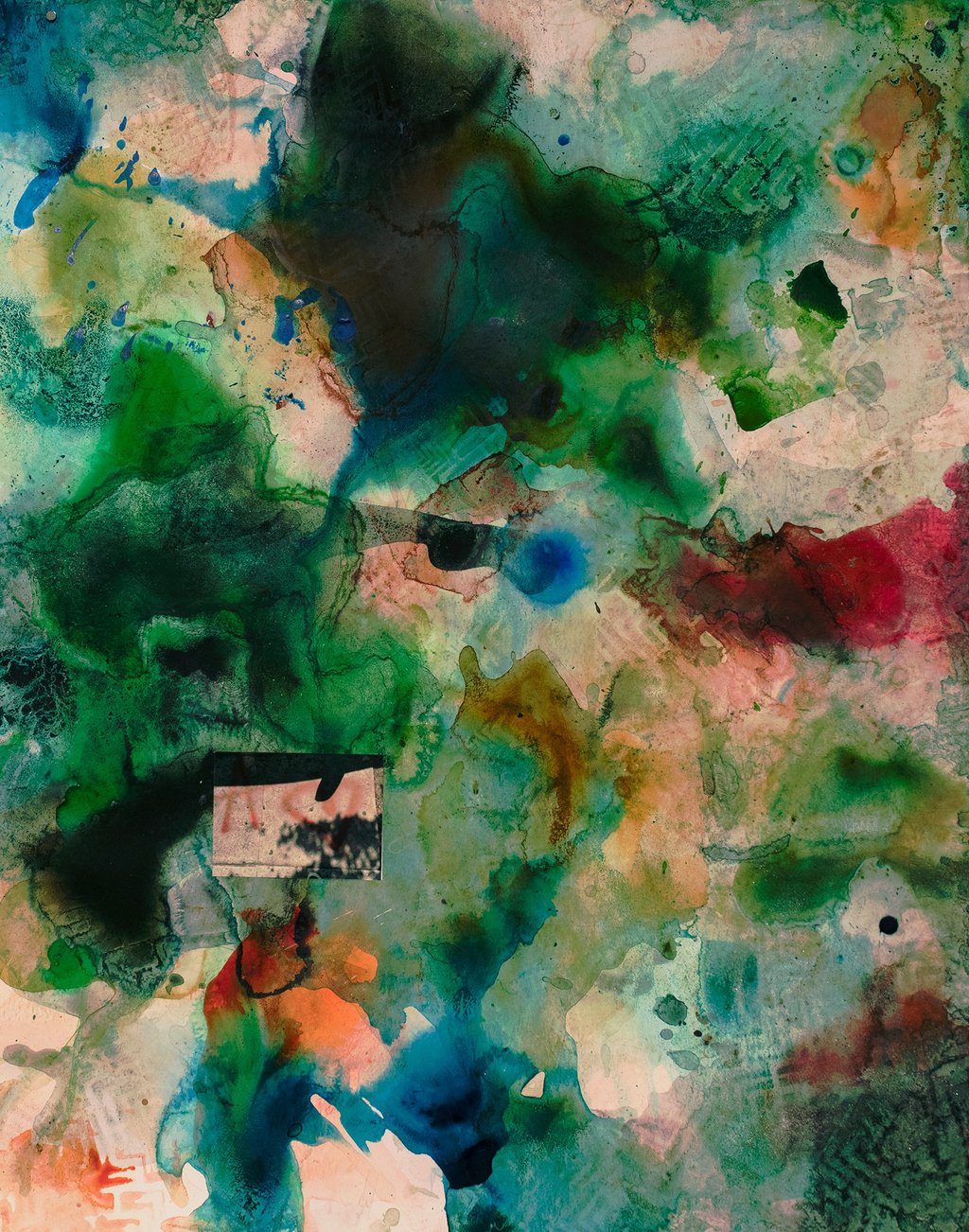 a drop in the ocean ~ watch, paint, beads, wire, thread, cat watch pieces, paint fragment, images, buttons, sea glass, stone, googly eyes, found ball, plastic pearls; 2024