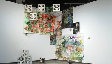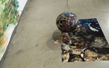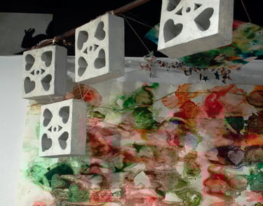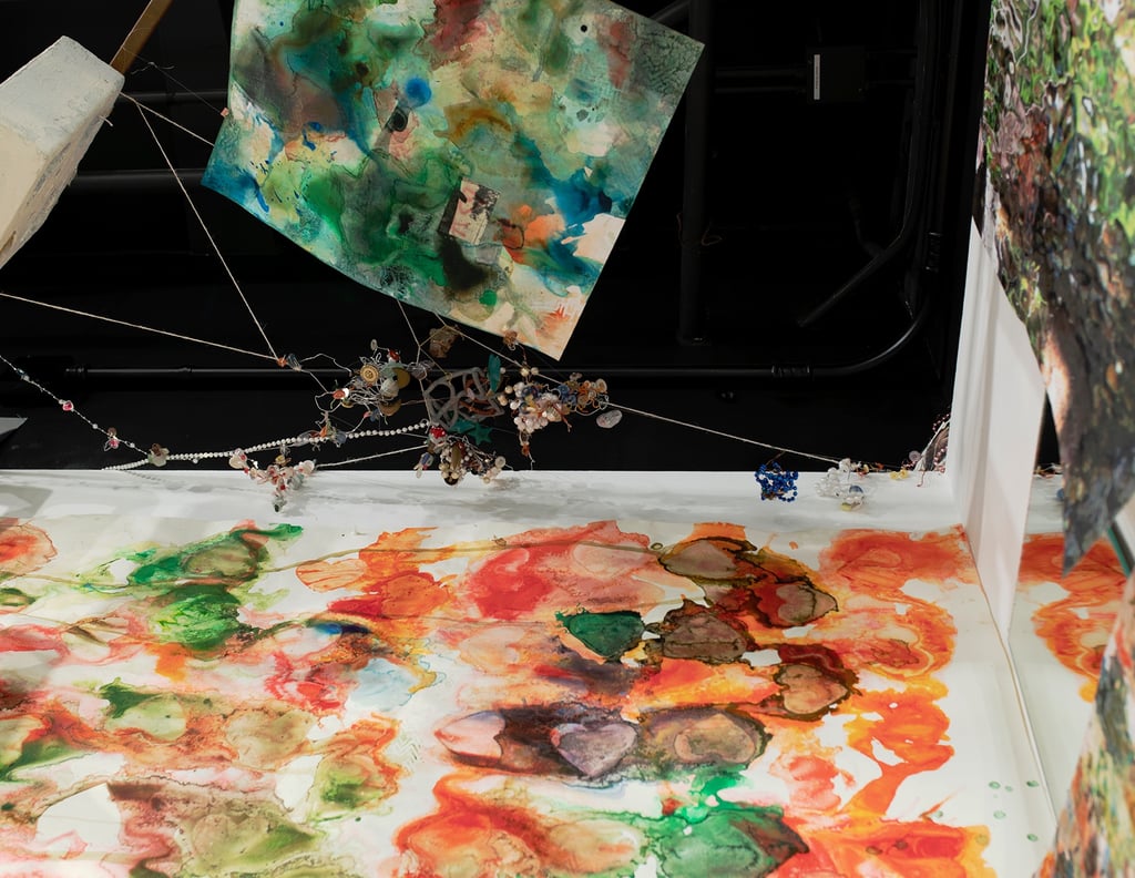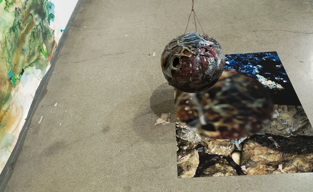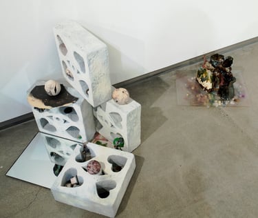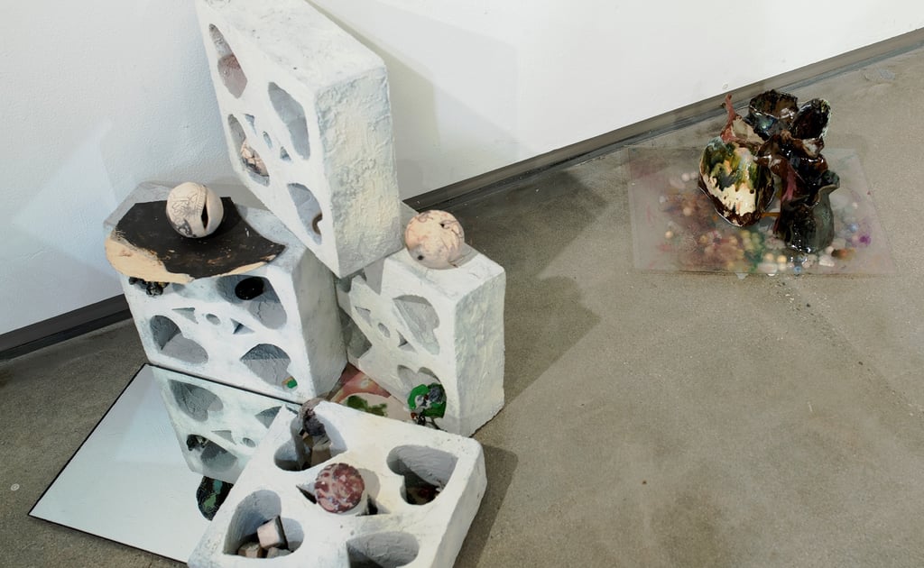 glazed + pit-fired ceramic, images, ink, paper, foam, thread, rope, steel, lights, battery, buttons, wire, hearts, beads and plastic pearls, watch face, sculpey, rocks, sea glass, shells, ball, rhinestones, mirrors, googly eyes, clips, push-pins, epoxy, wood, coral, shoe bits, dice